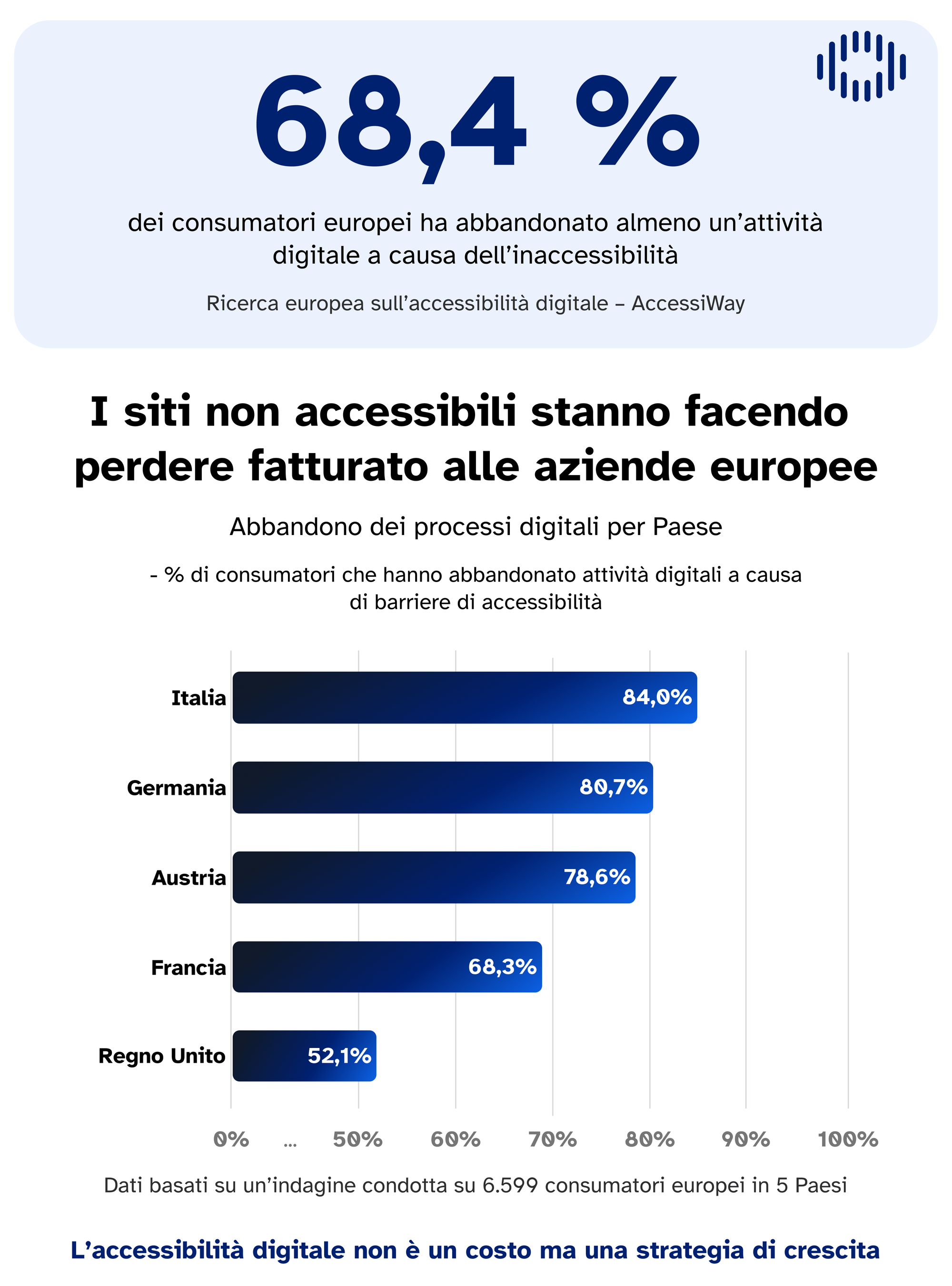 L’economia europea si scontra con un limite sempre più evidente: la mancanza di accessibilità. Dai risultati di un’indagine europea condotta da AccessiWay su 6.599 consumatori, tra Italia, Germania, Austria, Francia e Regno Unito, emerge che il 68,4% degli utenti ha già rinunciato ad almeno un’operazione digitale a causa di barriere legate all’accessibilità di siti web, applicazioni o contenuti online.