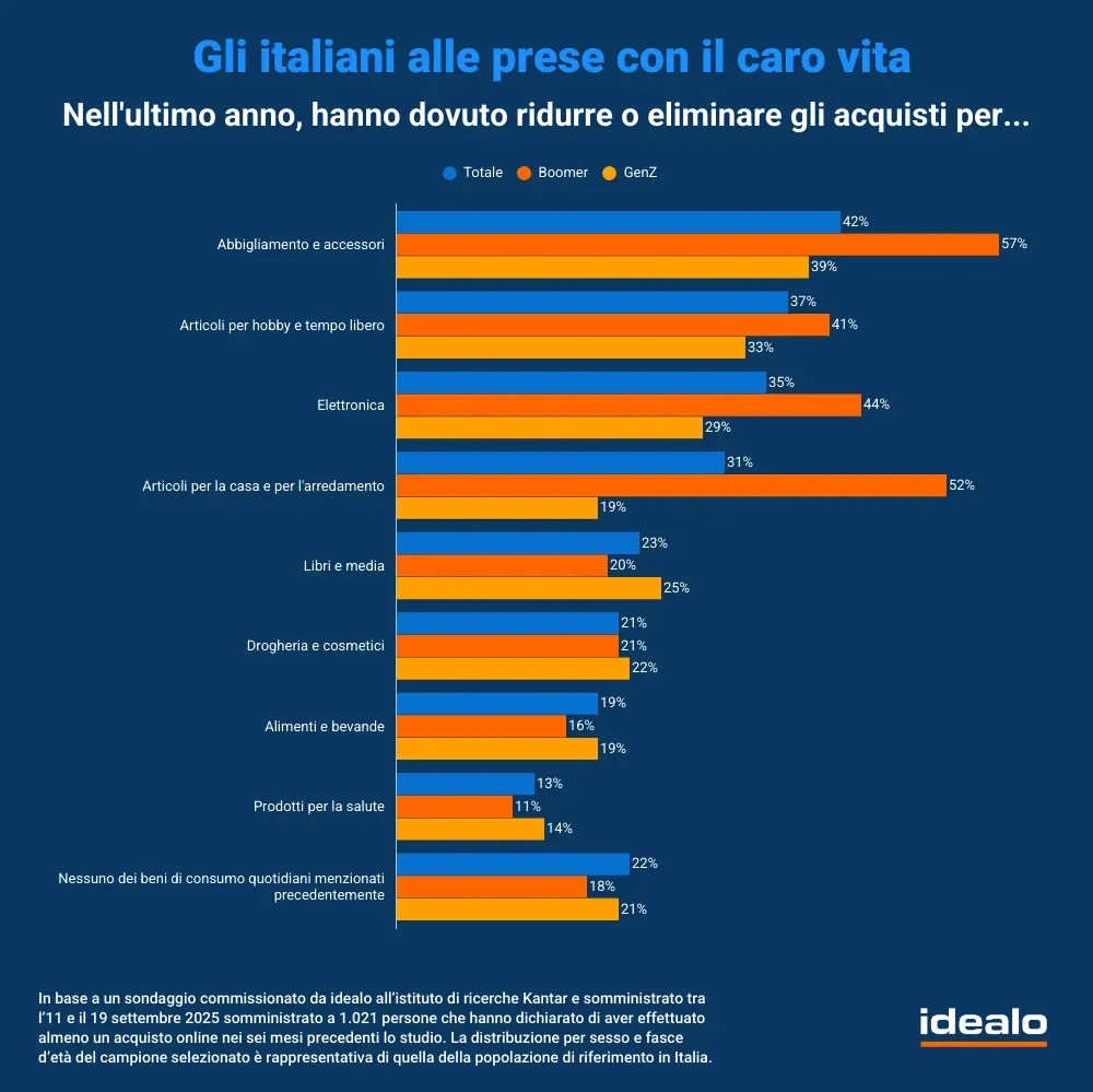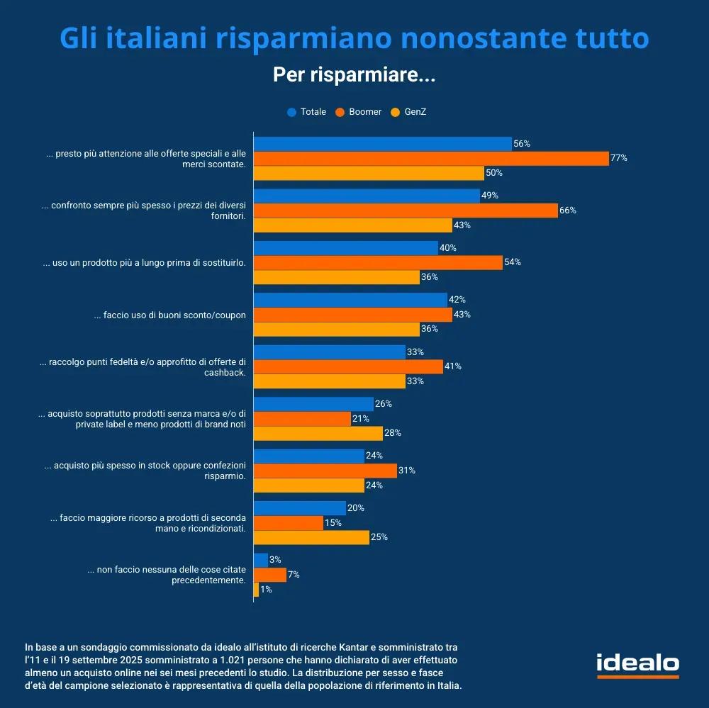 Le aree in cui vengono confrontati maggiormente i prezzi sono i beni di uso quotidiano (72%), come il cibo o i prodotti per l'igiene, e i grandi acquisti (65%), come elettrodomestici o biciclette, che già di loro tendono ad essere acquisti più ragionati perché più dispendiosi. Un’altra strada per risparmiare è quella di tagliare alcune spese: gli intervistati hanno dichiarato che nell'ultimo anno hanno cercato di risparmiare tagliando spese su abbigliamento e accessori (42%), hobby e tempo libero (37%) ed elettronica (35%). Tagli significativi sono stati attuati anche per quanto riguarda le attività culturali e di svago: quasi il 40% ha dovuto ridurre le spese relative a ristoranti e bar, mentre 1 italiano su 3 ha tagliato quelle legate a club e vita notturna, concerti e festival.