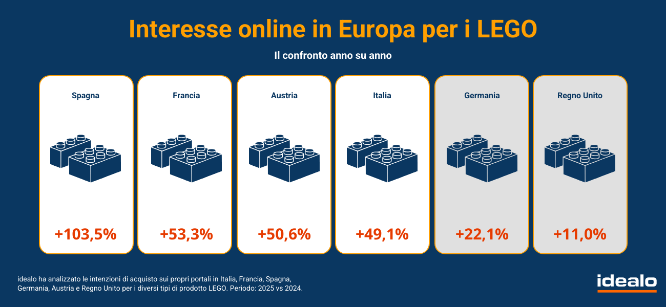 Gli “scaffali” dei giochi, anche quelli virtuali, non sono più un affare solo per bambini in previsione del Natale. I giochi, oggi, appartengono ad un universo che unisce intrattenimento, design, collezionismo e nostalgia, capace di parlare a pubblici diversi e di accompagnare i consumatori durante tutto l’anno. Un mercato dinamico, in continua trasformazione, in cui alcune categorie riescono più di altre a intercettare nuove passioni e a emergere come trend rilevanti. Tra queste, LEGO si conferma uno dei brand più seguiti, in termini di interesse online. In occasione del LEGO Day, che si celebra domani, idealo ha analizzato l’interesse dedicato ai giocattoli e ai prodotti LEGO nei principali mercati europei. I dati raccontano una realtà chiara: quando cresce l’interesse per LEGO, cresce anche l’attenzione complessiva verso il comparto dei giochi.