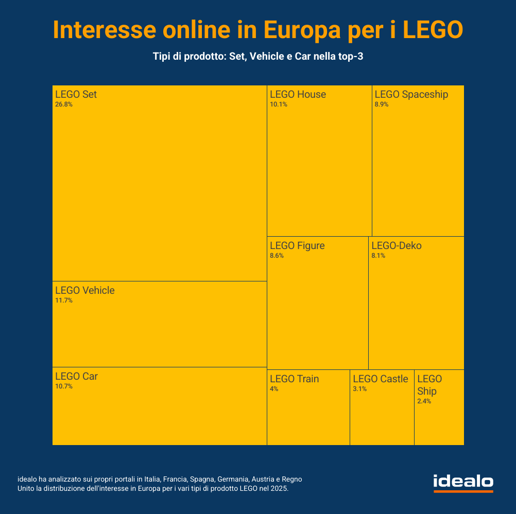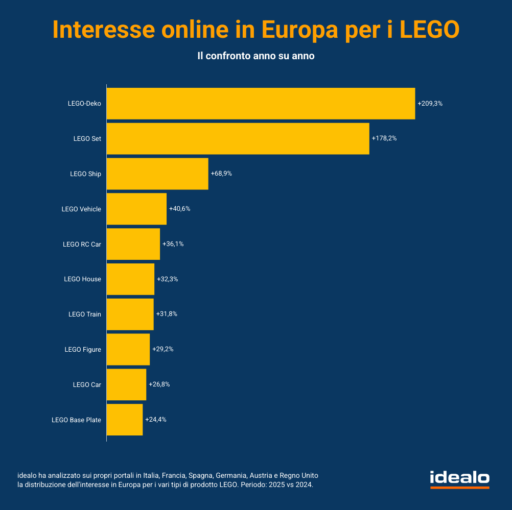 A cambiare non è solo quando si compra LEGO, ma anche come lo si vive. I dati idealo mostrano come in Europa stiano crescendo soprattutto le categorie più trasversali e orientate a un pubblico adulto. Su base annua, LEGO Deko registra un aumento del 209%, mentre i LEGO Set crescono del 178%, seguiti da LEGO Ship (+69%) e dai veicoli (+41%). LEGO diventa così sempre più un oggetto di design, da collezione e da esposizione, capace di entrare stabilmente nelle case anche al di fuori della cameretta. In particolare, nel 2025, in tutti i mercati europei, i LEGO Set restano la tipologia di prodotto più cercata su idealo. In Italia, invece, emerge una peculiarità che racconta molto dei gusti locali: auto e veicoli LEGO hanno un peso superiore rispetto ad altri Paesi, con LEGO Car che raggiunge il 17% dell’interesse e LEGO Vehicle il 15%. Un dato che riflette la passione italiana per motori, design e grandi icone dell’ingegneria.