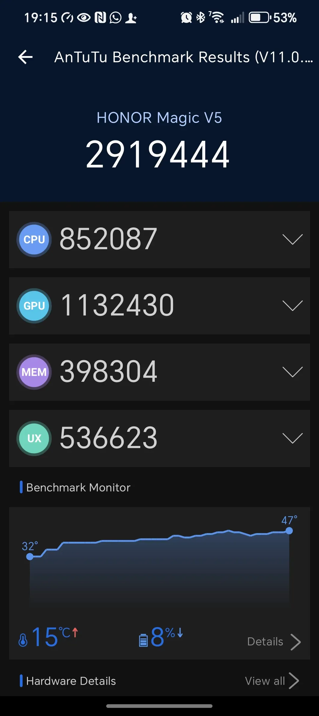 Le prestazioni complessive del Magic V5 sono superbe e gli consentono di competere con qualsiasi altro smartphone di punta attualmente sul mercato. In termini di hardware, esso è dotato del miglior prodotto di Qualcomm: il chipset Snapdragon 8 Elite, una delle CPU più potenti del 2025, abbinato a una velocissima RAM LPDDR5X da 16 GB e 512 GB di spazio di archiviazione UFS 4.1.
