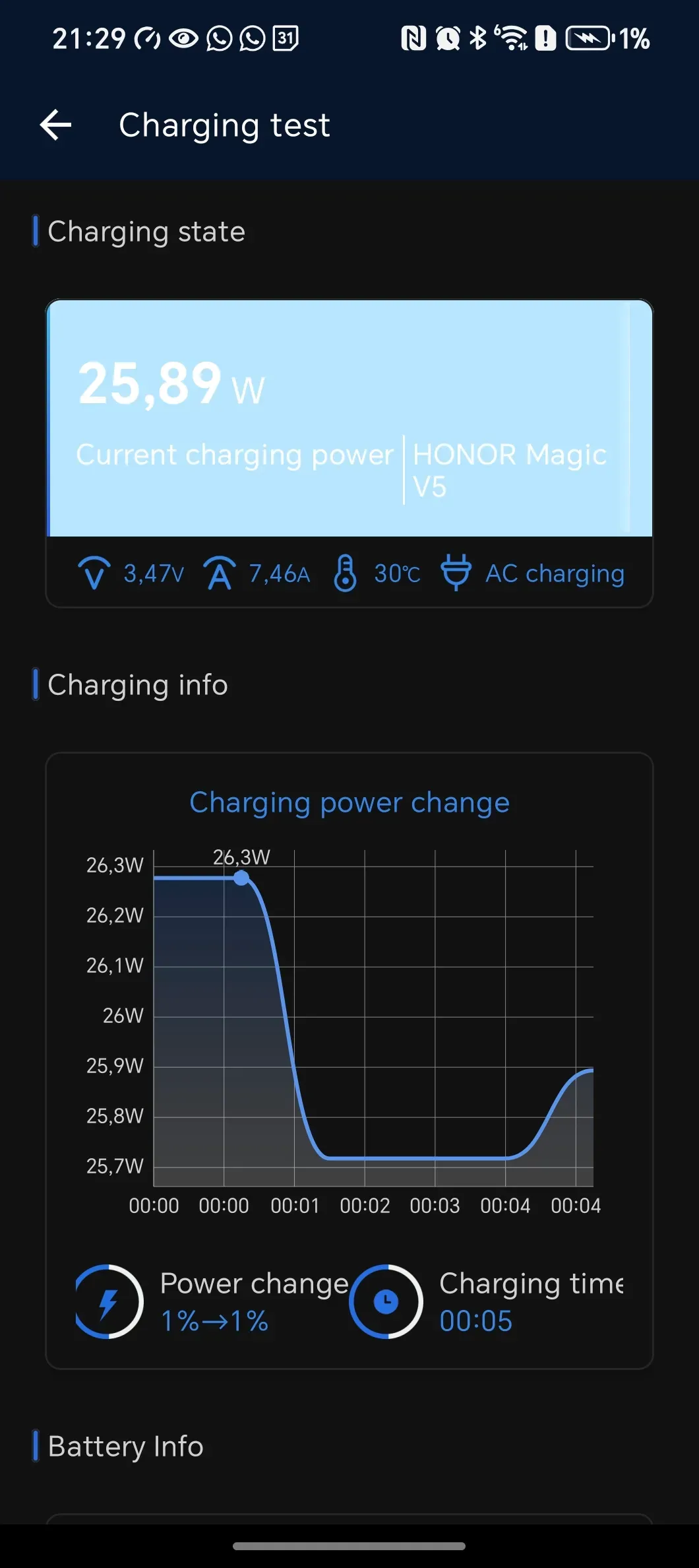 In fase di ricarica la batteria del Magic V5 ha toccato i 45W quasi, coprendo il 50% in meno di 30 minuti partendo da zero e completando l'intero ciclo di ricarica in 66 minuti