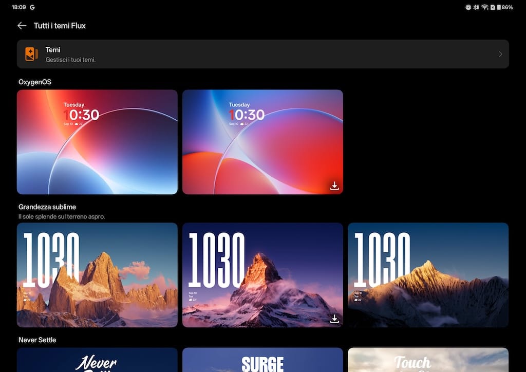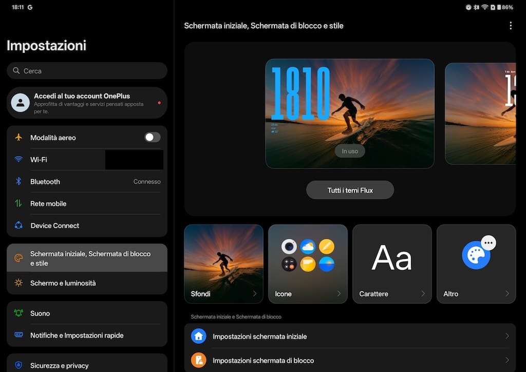 Sono disponibili numerose opzioni di personalizzazione della schermata di blocco e della schermata iniziale: ad esempio, è possibile regolare la dimensione dell'orologio (e l'effetto profondità) e aggiungere un gruppo di widget. Nella schermata iniziale è possibile scegliere tra numerosi sfondi (grazie a Flux Themes), insieme a opzioni per i colori del sistema e la gestione delle icone (dimensioni, angoli arrotondati, nome dell'app) e temi (tra cui Flux, Radiance, Shadow, ecc.).
