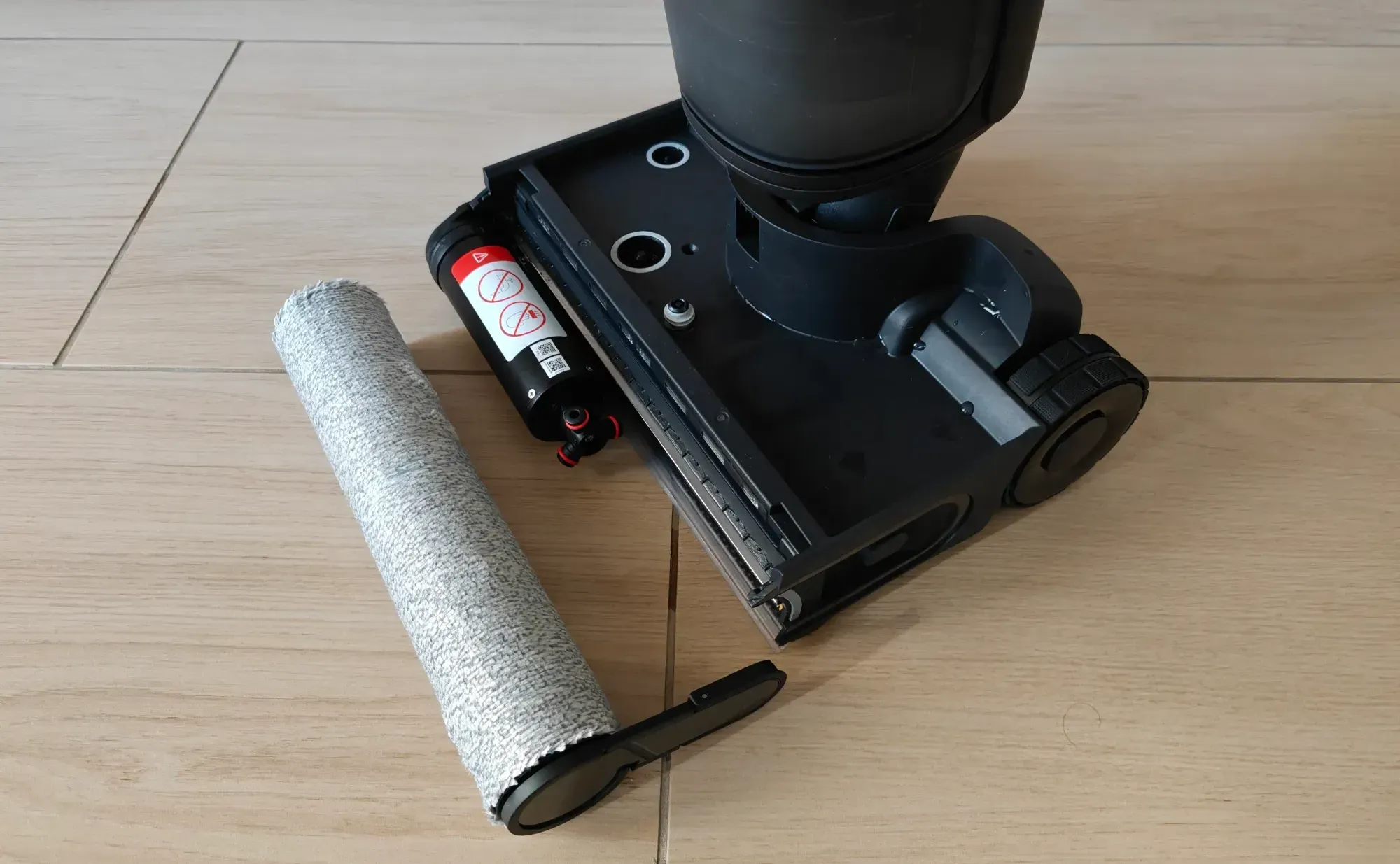 Il Roborock F25 Ultra è davvero semplice montare e configurare: 10 minuti, ecco il tempo che occorre per avere l'F25 Ultra pronto al primo utilizzo. Nei tanti test effettuati, le prestazioni nelle diverse modalità a disposizione mi hanno lasciato molto soddisfatto. In particolare, ho potuto apprezzare come l'aspirazione da 22.000pa sollevi con facilità i detriti senza la necessità di un ulteriore passaggio. In questa fase, uno specifico sensore di rilevazione dello sporco (DirTec Smart Sensor) rileva in tempo reale, tramite una luce ad infrarossi, il livello di sporco che l'aspirapolvere incontra sulla sua strada, adeguando automaticamente il livello di potenza. La vaschetta dell'acqua pulita, montata superiormente al rullo (foto sotto) contiene, in un serbatoio separato di 100ml, il liquido detergente che verrà mescolato all'acqua in maniera completamente automatica. L'autonomia del detergente è di un mese circa.