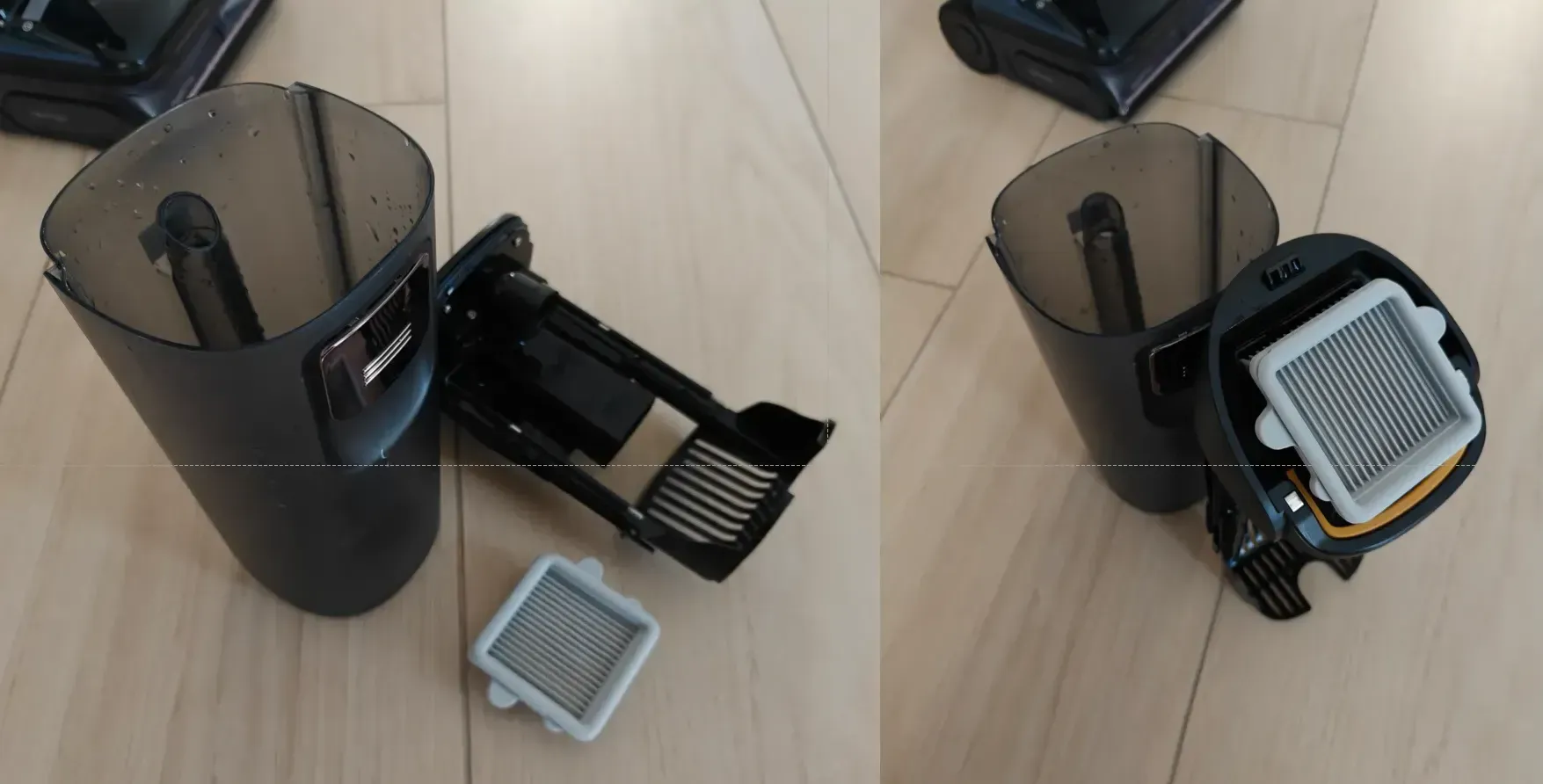 Il Roborock F25 Ultra ha un serbatoio situato sulla parte frontale dell'aspirapolvere. Il suo colore opaco lascia intravedere il livello di acqua sporca raccolta al suo interno: un messaggio acustico emesso dall'aspirapolvere, ci informerà che è il momento di procedere allo svuotamento. A questo punto, non ci resta che sganciare il serbatoio tramite l'apposito pulsante (foto sopra), separare la parte superiore dove alloggia il filtro e gettare via l'acqua residua. Il sistema è molto pratico ed è studiato per facilitare questa operazione, rendendola semplice, veloce e senza rischi di sporcarsi a causa di schizzi.