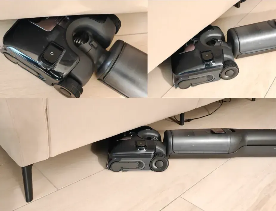 La cerniera FlatReach 2.0 invece, consente di manovrare l'aspirapolvere sotto i mobili piegando il braccio fino a 180°, fino ad uno spessore minimo di 13cm.